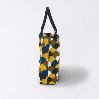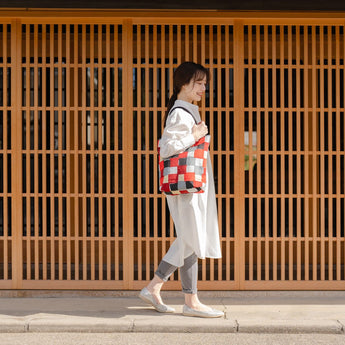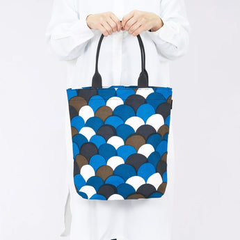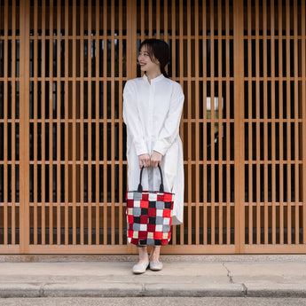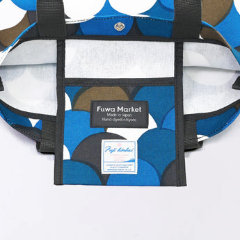 この縦型トートバッグはFuwa Marketのオリジナルテキスタイルで、京都の染色工場で職人が一つひとつ手作業で仕上げた特別な逸品。