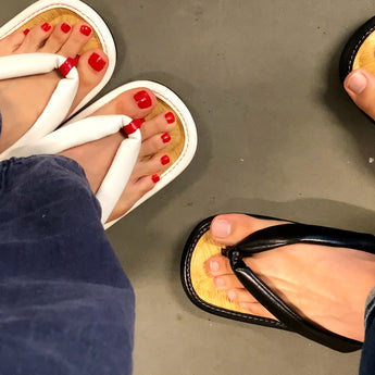 昔ながらの草履には「左右」がありませんが、初めての方でも履きやすくするために、鼻緒の位置を右と左でずらしてあります。