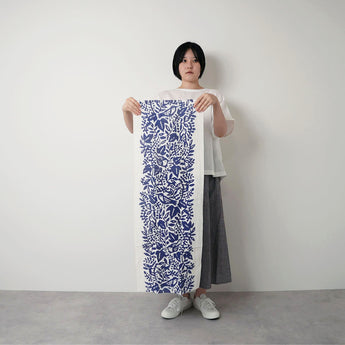 たて糸を綿、よこ糸を麻で織った綿麻生地のてぬぐいです。綿麻てぬぐいは丈夫で吸水性がよく、乾きやすいのが特徴です。張りのあるさらりとした手触りでインテリアにも馴染みやすく、掛ける・敷く・拭くなど様々な用途でお使いいただけます。