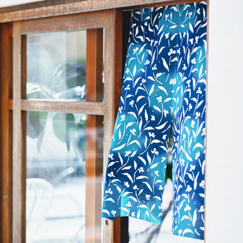 朝に花を咲かせ昼には萎んでしまう様子から、儚く美しい植物として人々の心を動かしてきた露草を繊細な線で表現しました。紺地に水色のぼかし染めは、暑い夏の季節にひと時の涼やかさを演出します。ストールや半衿などファッションアクセサリーとして、また、インテリアとしてお部屋に飾っていただくのもおすすめです。
