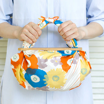 風呂敷のサイズは約70cm。小さめの財布、スマートフォン、ハンカチ、ハンドクリーム、ポーチなどが入ります。