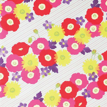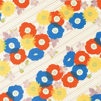 ポピーやマーガレット、ガーベラ、クレマチスなど人気の花をブーケにしたような華やかなデザインで、庭の花壇で咲き乱れる様子を描いています。