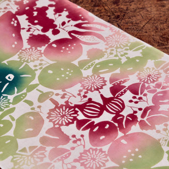 秋の森散歩がモチーフのデザイン。さつまいも、栗、柿、ザクロ、あけびなど秋の味覚が色とりどりに描かれ、ジョウビタキの姿もそっと混ざっています。