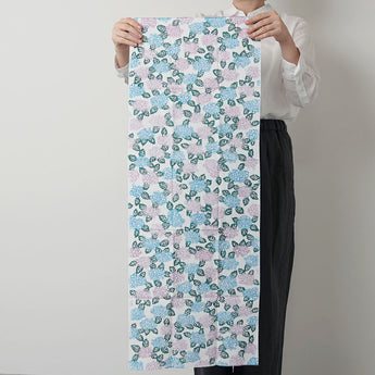 あじさいの柔らかな色合いと移ろいを、職人の手仕事による注染(ちゅうせん)で表現しました。にじみや濃淡が活きた一枚は、雨の季節にぴったりのしっとりとした美しさを届けてくれます。