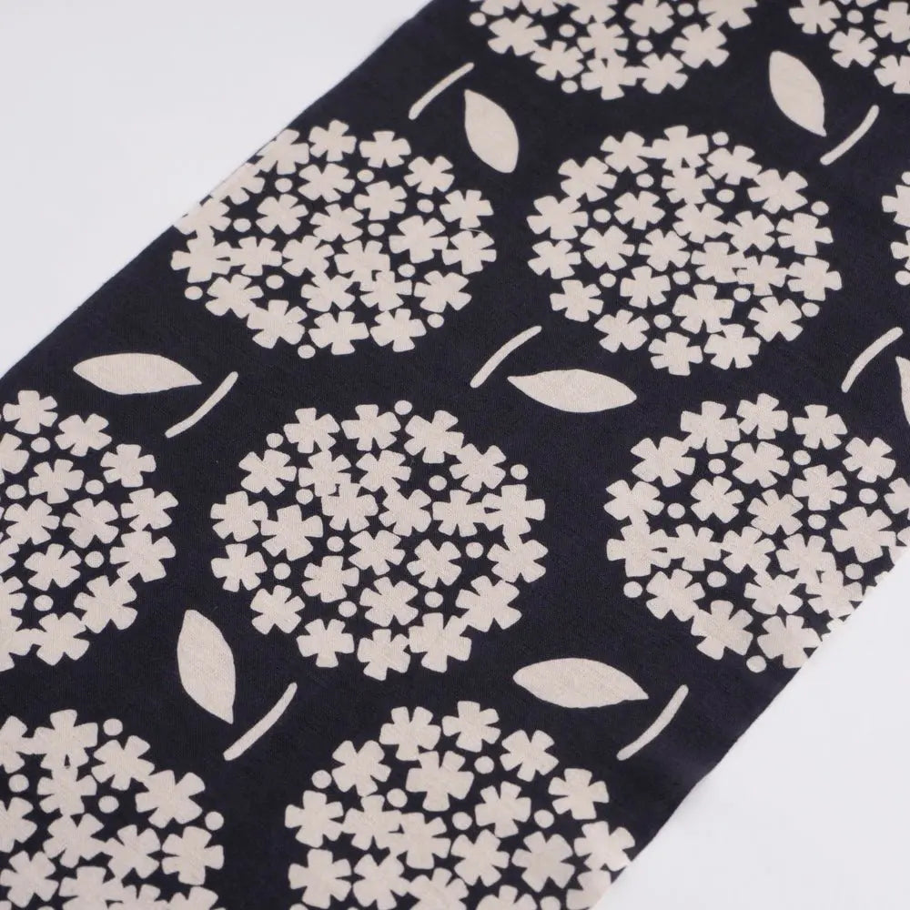 This tenugui is made of cotton and linen fabric, with the warp made of cotton and the weft made of hemp. The soft round florets add a touch of beauty to the mustard-colored and ink-colored base.
