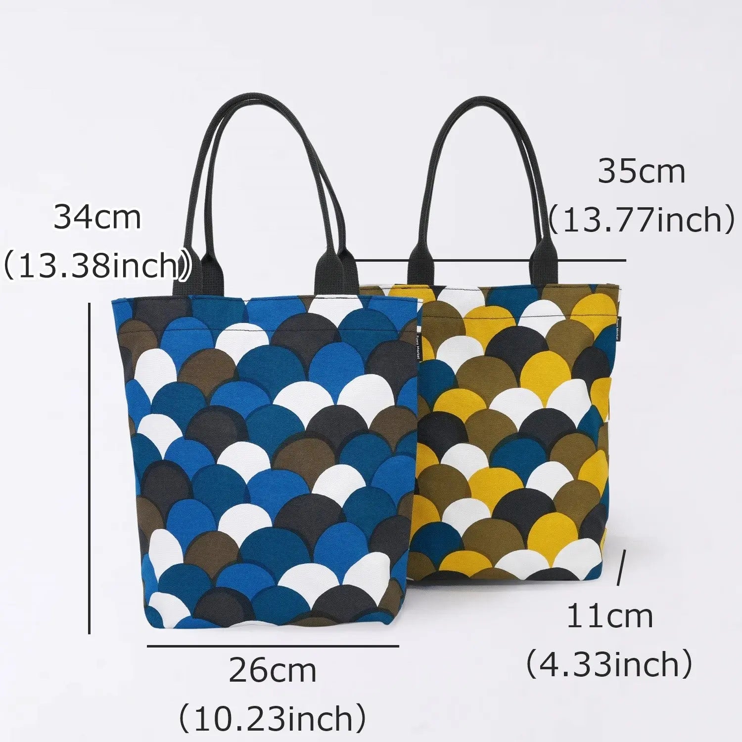 세로형 토트백의 사이즈는 세로 34cm× 가로 35cm (바닥 가로 26cm) 입니다.