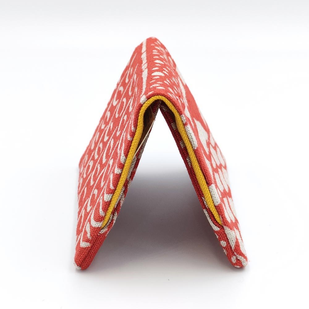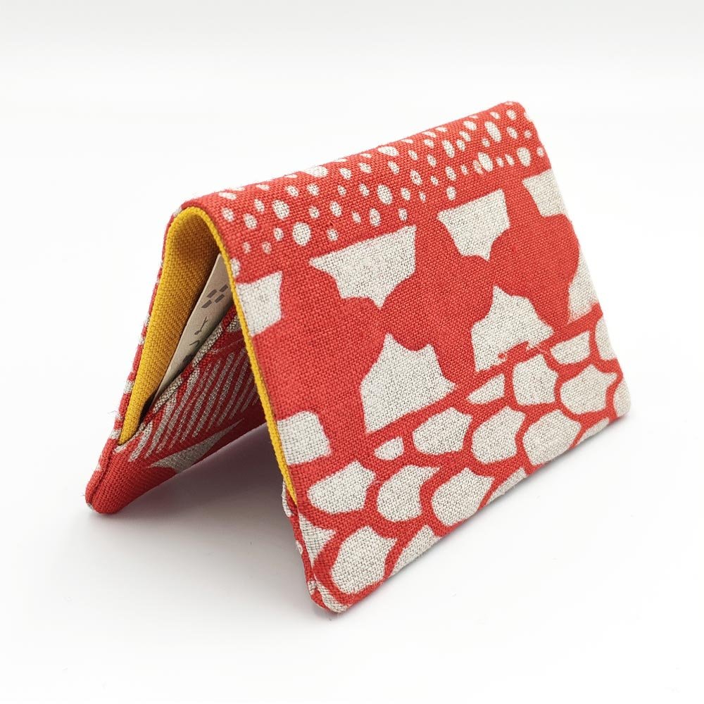 在這裡,使用日本傳統技法「型染」與「筒描」,在布料上施加圖案,並將其作為素材製作名刺夾等產品。